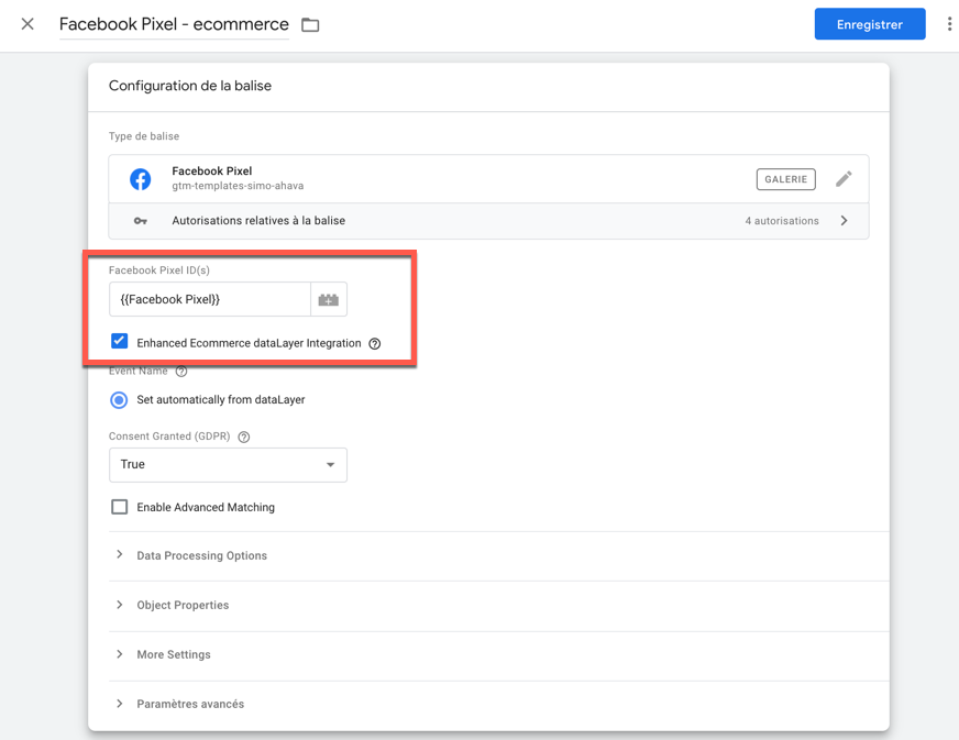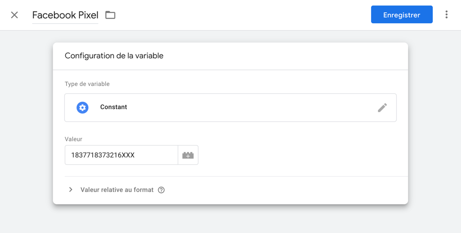 7 - Once the tag type is correctly added, in the Facebook Pixel ID(s) field click on the brick icon and select the Facebook Pixel variable.