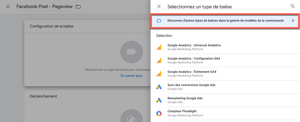 4 - Search for Facebook to filter tag types and select the Facebook Pixel tag type