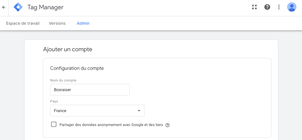 2 - In Account Setup, enter your company name as the account name, choose your country and optionally specify if you want to share anonymous data with Google and third parties.
