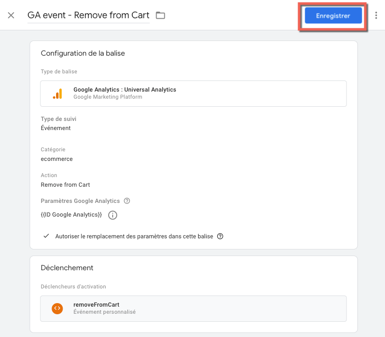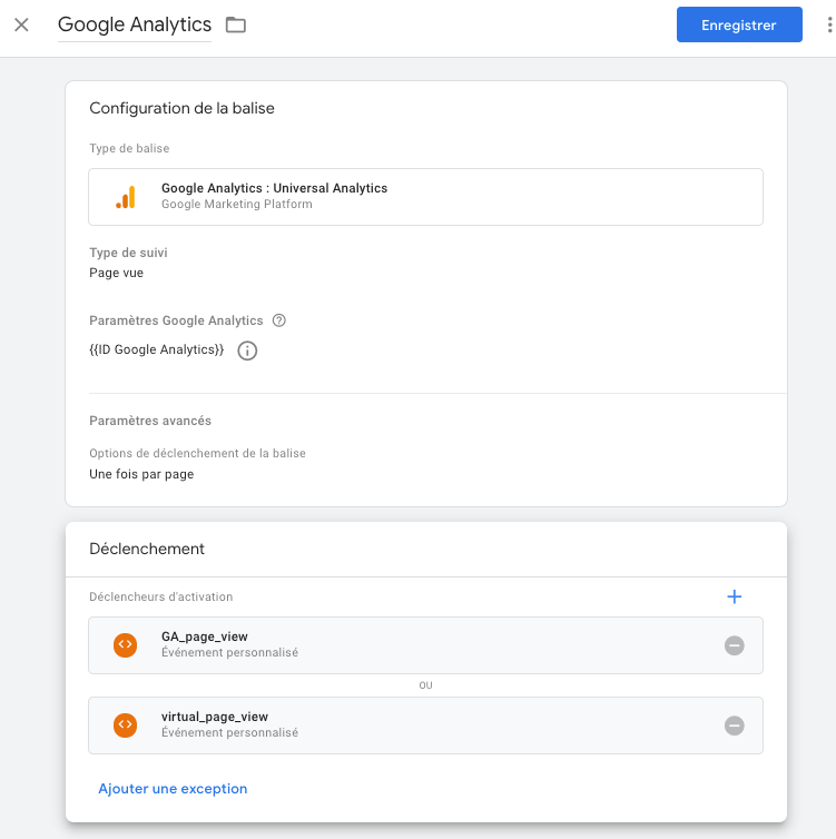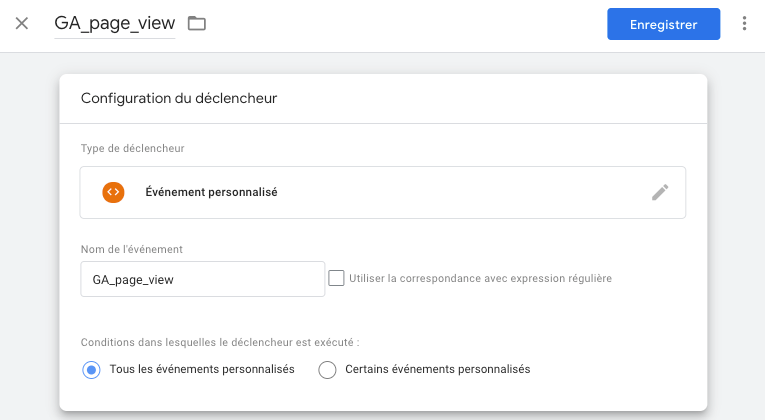 17 - Once the trigger is selected, enter exactly the following value in the Event Name field: GA_page_view. Click on Save