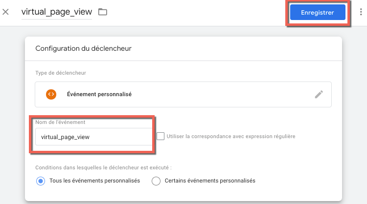 21 - Once the trigger is selected, enter exactly the following value in the Event Name field: virtual_page_view. Click on Save