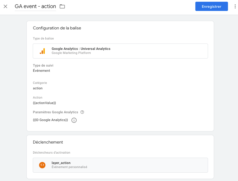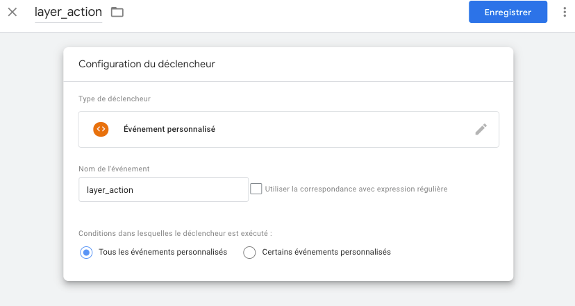8 - Assign the name layer_action to your trigger. Click on Trigger Configuration and select the Custom Event trigger type