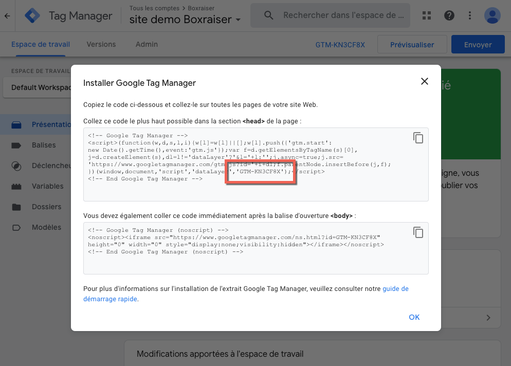To install Google Tag Manager on your site, simply copy the container ID (GTM-XXXX) into the dedicated field of your admin panel: