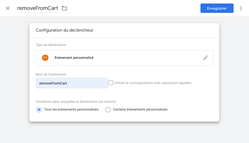 8 - Assign the name removeFromCart to your trigger. Click on Trigger Configuration and select the Custom Event trigger type