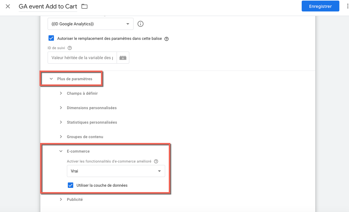 6 - In more settings, select E-commerce. In Enable Enhanced Ecommerce Features select True then check use data layer.