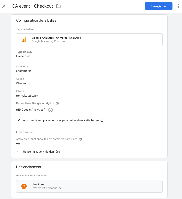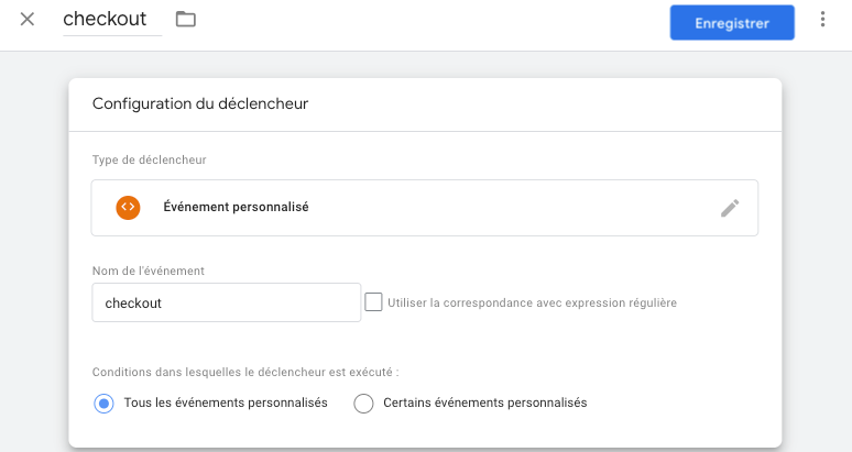 8 - Assign the name checkout to your trigger. Click on Trigger Configuration and select the Custom Event trigger type