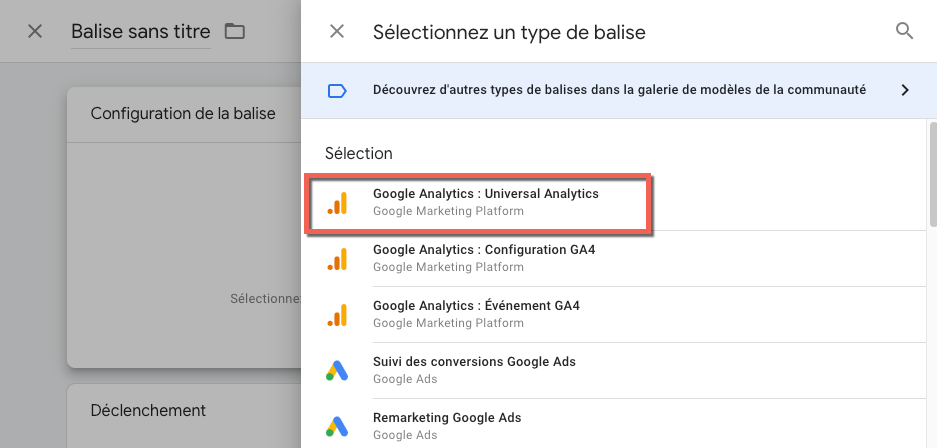 2 - The tag configuration page appears. Click on Tag Configuration and select Google Analytics: Universal Analytics.