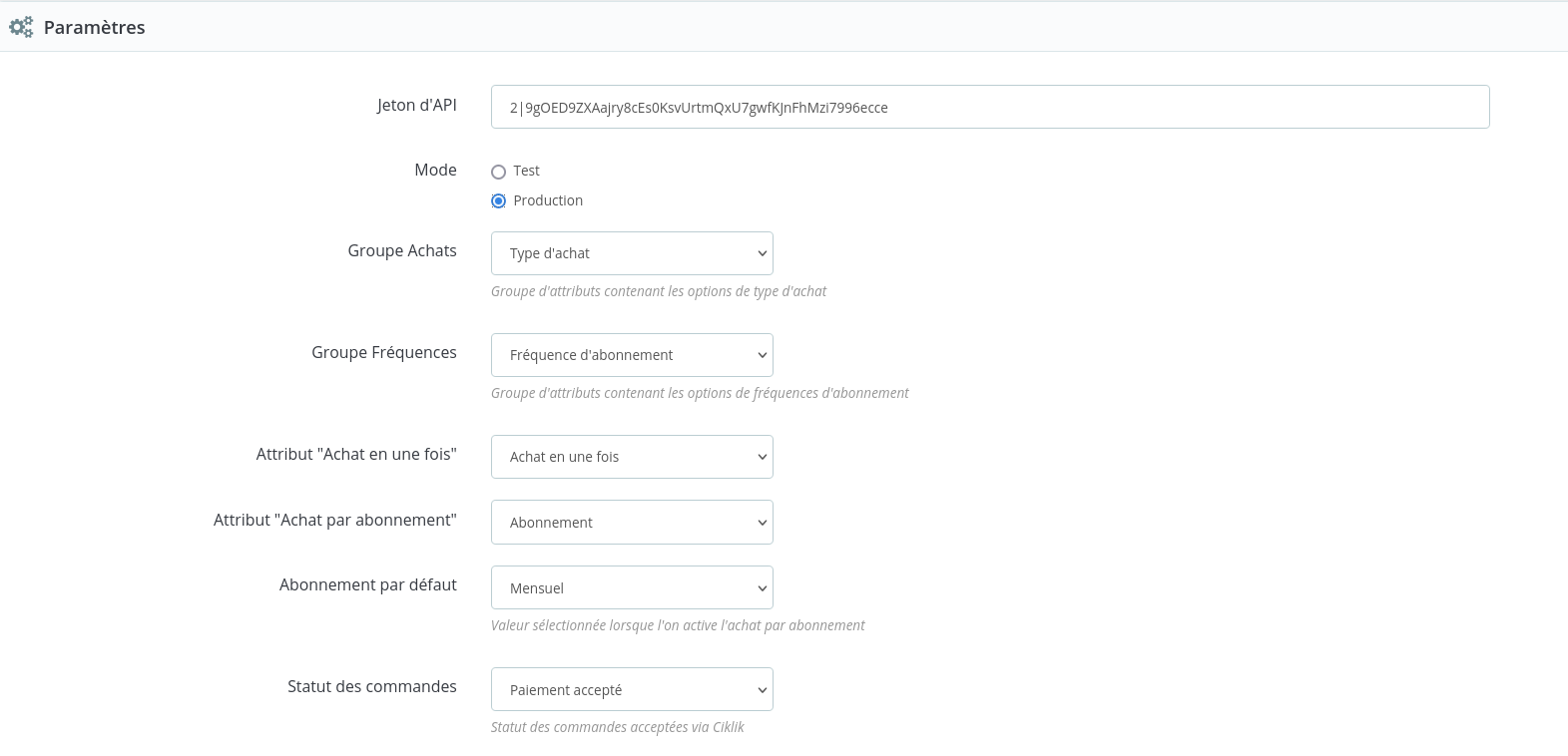 When configuring the module, you will need to enter the token provided to you after creating your PrestaShop space in Ciklik.