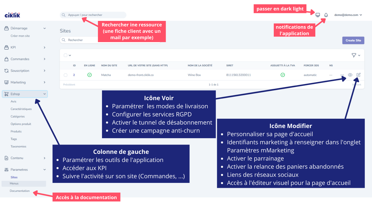 Vous retrouvez un raccourci vers la Ciklik Academy (Documentation) en bas de cette colonne.